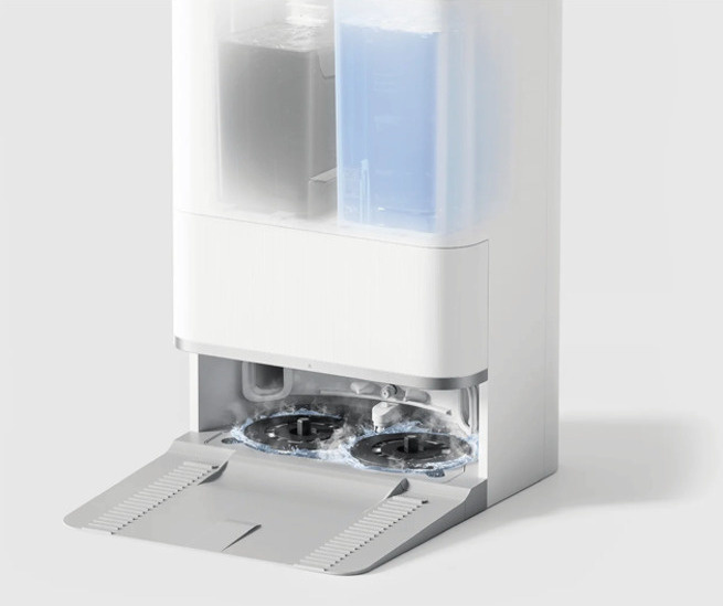 Vylepšená základná stanica ponúka komplexnú starostlivosť o podložky mopu vďaka dvom škrabacím ramenám so samočistiacou funkciou. Systém prania horúcou vodou s teplotou do 80 °C rýchlo uvoľní odolné škvrny, zatiaľ čo vysokorýchlostné rotačné kefovanie zabezpečí dôkladné čistenie. Po skončení nasleduje dvojhodinové rýchle sušenie horúcim vzduchom. Veľkorysá 4-litrová nádrž na čistú vodu minimalizuje potrebu častého dopĺňania. Dve otočné škrabky automaticky čistia dosku mopu počas vytierania, čím sa znižuje hromadenie nečistôt.